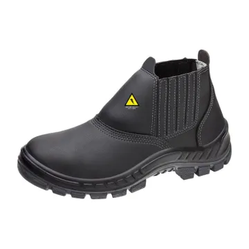 Bota de segurança com proteção elétrica e mecânica, confeccionada em microfibra, fechamento em elástico nas laterais, forração interna, com biqueira de plástico e solado bidensidade.