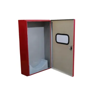 Caixa de abrigo de mangueira (hidrante) em fibra, do tamanho 60x90x28cm. Porta de abrir para fora, com dobradiça metálica e visor de acrílico. Reforço interno para fixação. Haste metálica laminada para fixação da mangueira.