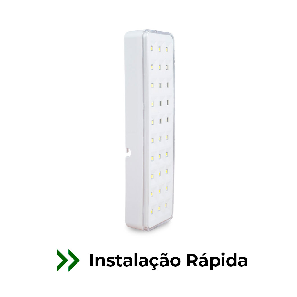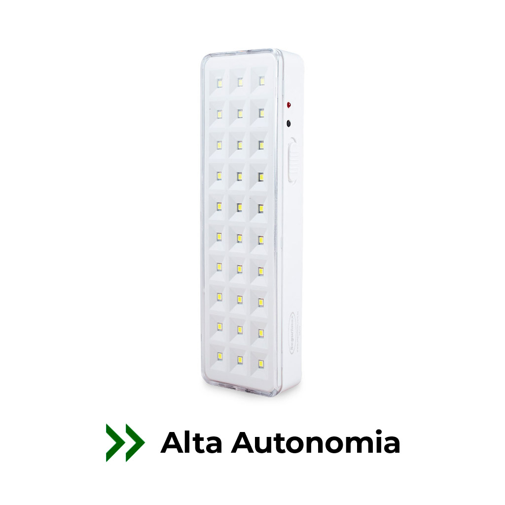 A 30 LEDs Super Slim é uma luminária compacta e potente, projetada para proporcionar iluminação de emergência de alta eficiência. Com tecnologia LED e bateria de lítio, oferece baixa manutenção, economia de até 70% e até 5 horas de autonomia.