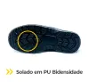 - Solado: PU bidensidade bicolor, com sistema de absorção de impacto, injetado diretamente no cabedal.