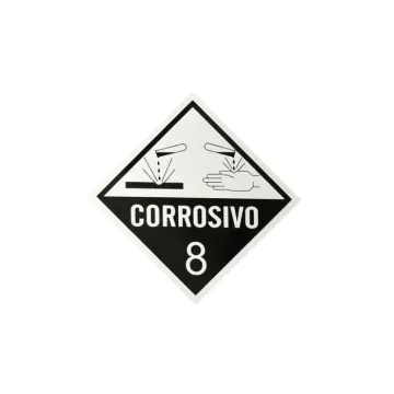 Placa de identificação fabricada em PVC rígido, com impressão em silk, para sinalizar o transporte de produtos corrosivos, conforme NBR 7500.