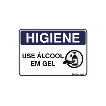 Placa em PVC com fundo branco com cores azul e descrição preto com indição de "use álcool gel".